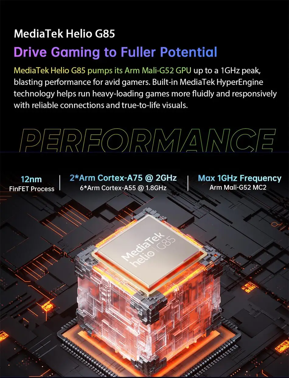MediaTek Helio G85 pompuje procesor graficzny Arm Mali-G52 do 1GHz, wydajność strumieniowa dla zapalonych graczy. Wbudowana technologia MediaTek HyperEngine pomaga uruchomić ciężkie ładowanie gier bardziej płynnie i responsywnie dzięki niezawodnym połączeniom i realistycznym wizualizacjom.