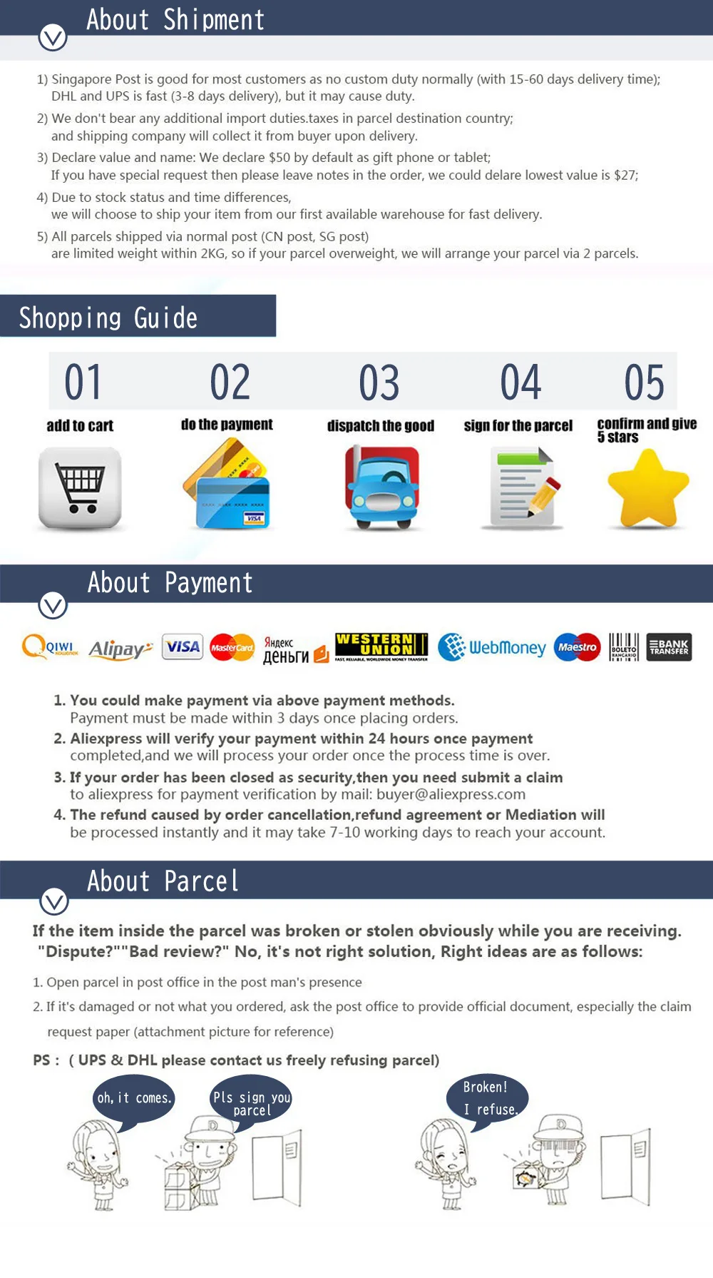 1. Gdy paczka przychodzi, proszę sprawdzić go twarzą w twarz, aby sprawdzić, czy towary dotrze w dobrym stanie przed podpisaniem. Jeśli uszkodzony lub jakikolwiek problem, skontaktuj się z naszym działem obsługi klienta, aby uzyskać pomoc i rozwiązać problem.