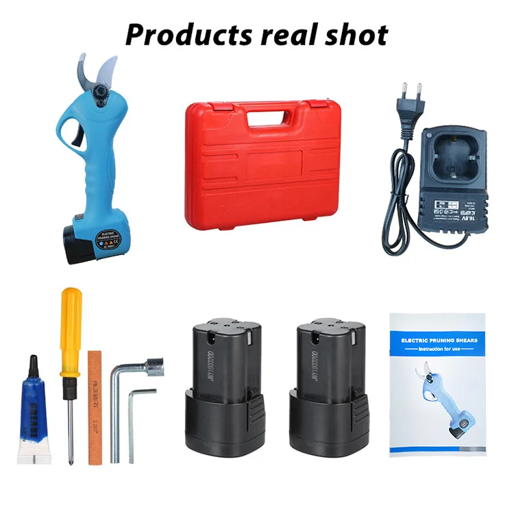Lista towarów: pudło do pakowania, nożyce do cięcia jog, instrukcja obsługi, śrubokręt, smar, ładowarka, osełka, klucz sześciokątny, gniazdo sześciokątne
