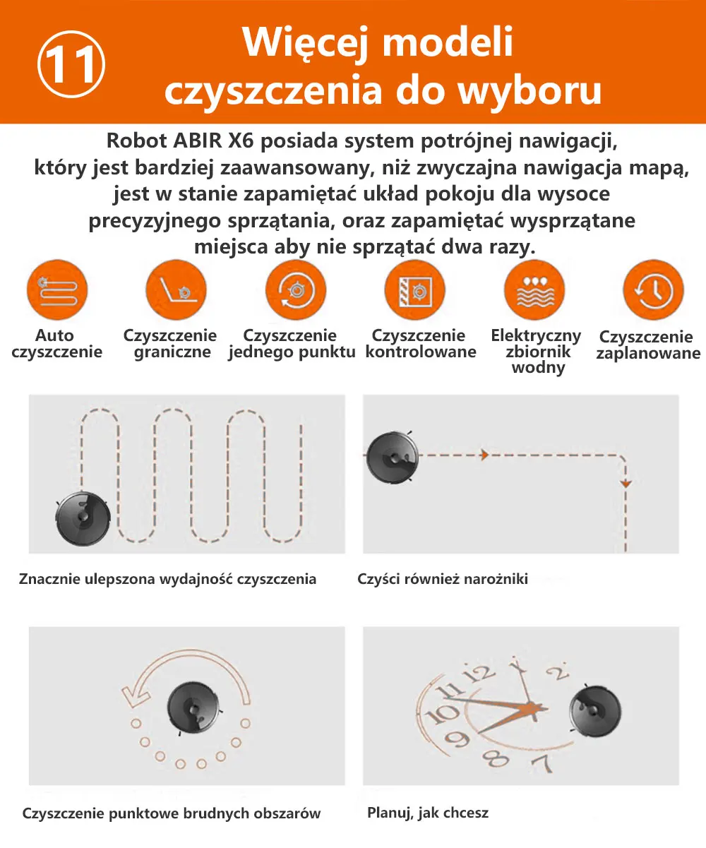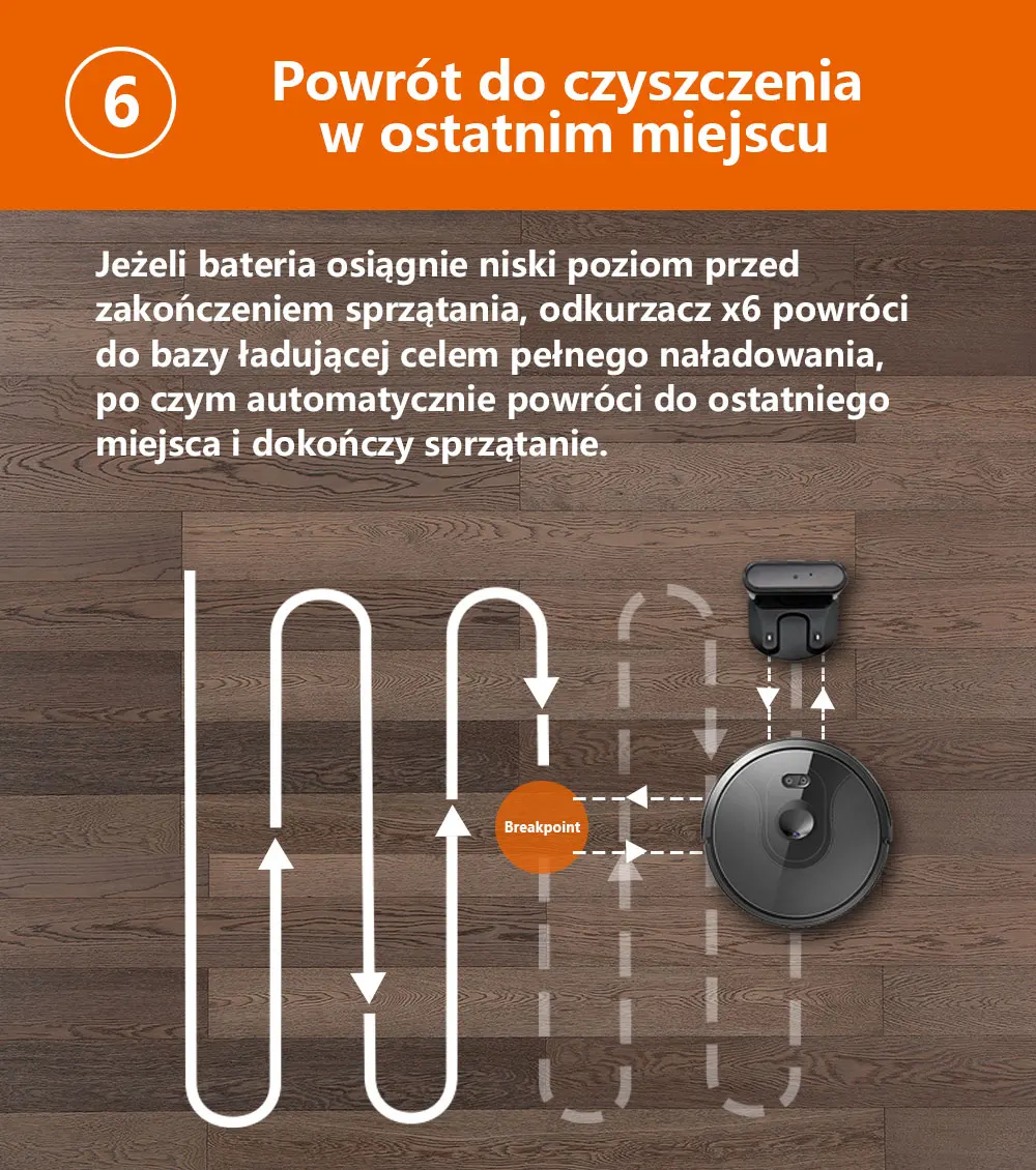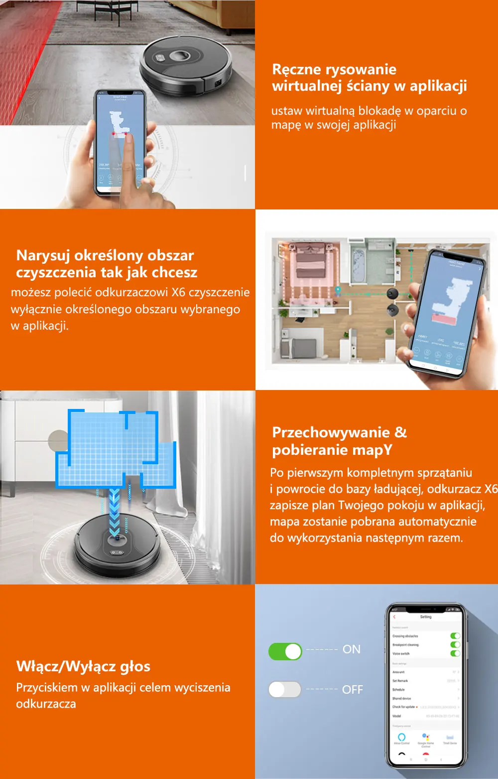 5. X6 ma wiele zaawansowanych funkcji od potrójnej nawigacji kamery. Możesz skierować X6 do czyszczenia określonego miejsca na mapie, możesz wybrać obszar, który chcesz wyczyścić na mapie. Możesz ustawić 4 szt. Wirtualnych barier na mapie. X6 może również zrobić punkt przerwania wznowić czyszczenie, przy następnym czyszczeniu możesz znaleźć mapę aplikacji w aplikacji. X6 działa wydajniej niż inne roboty z nawigacją po mapie 2D.