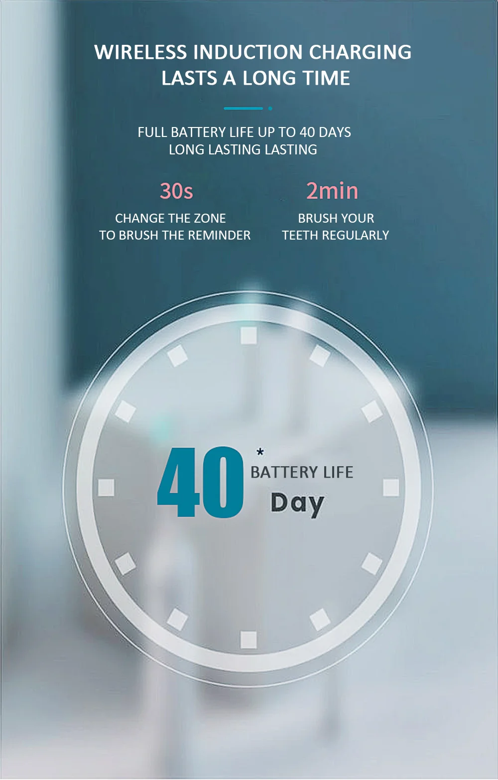 Pełne ładowanie elektrycznej szczoteczki do zębów może być używane przez ponad 40 dni (2 razy dziennie, 2 minuty za każdym razem).