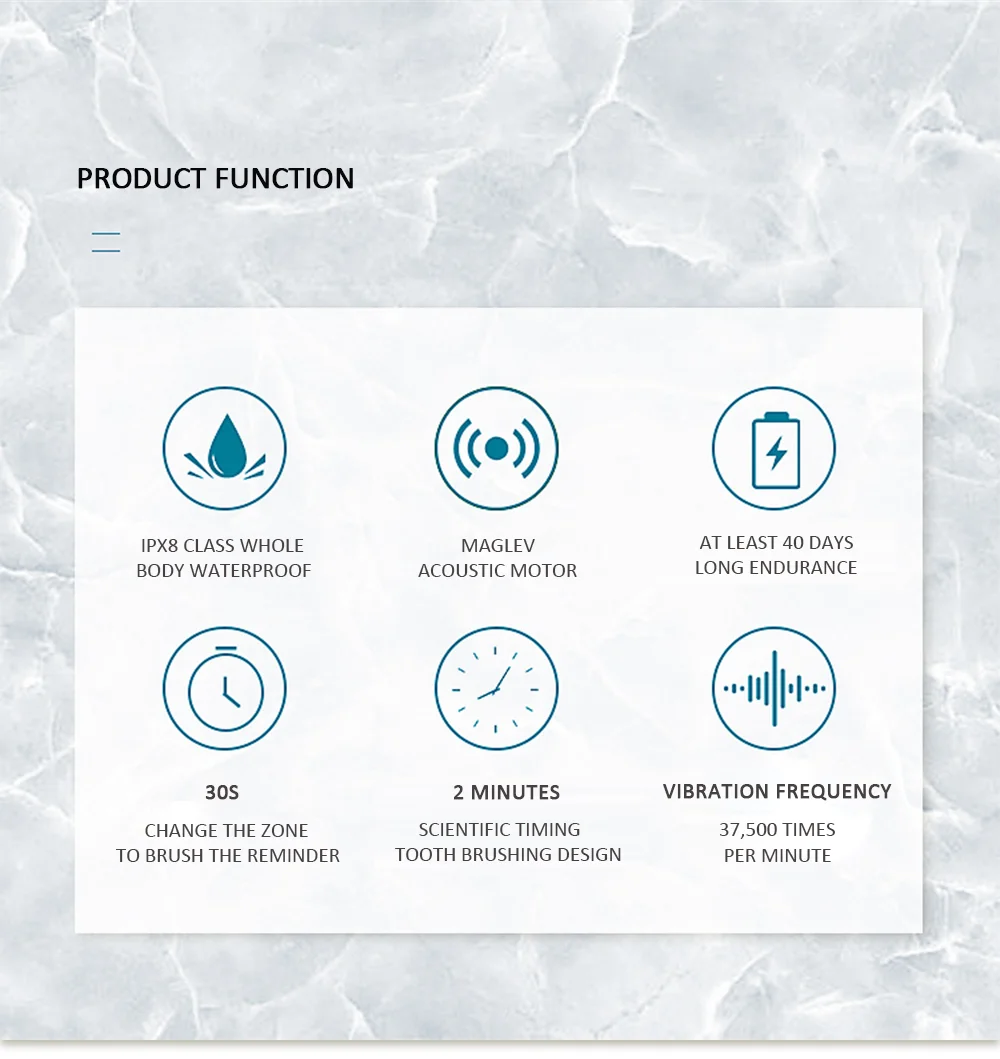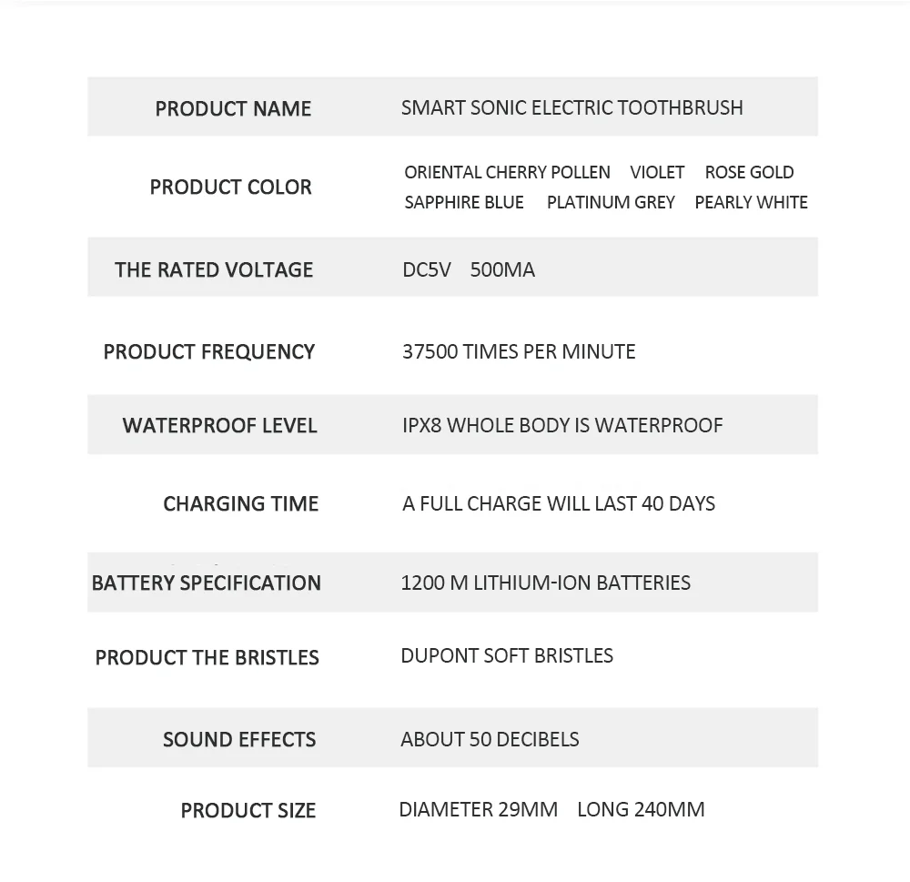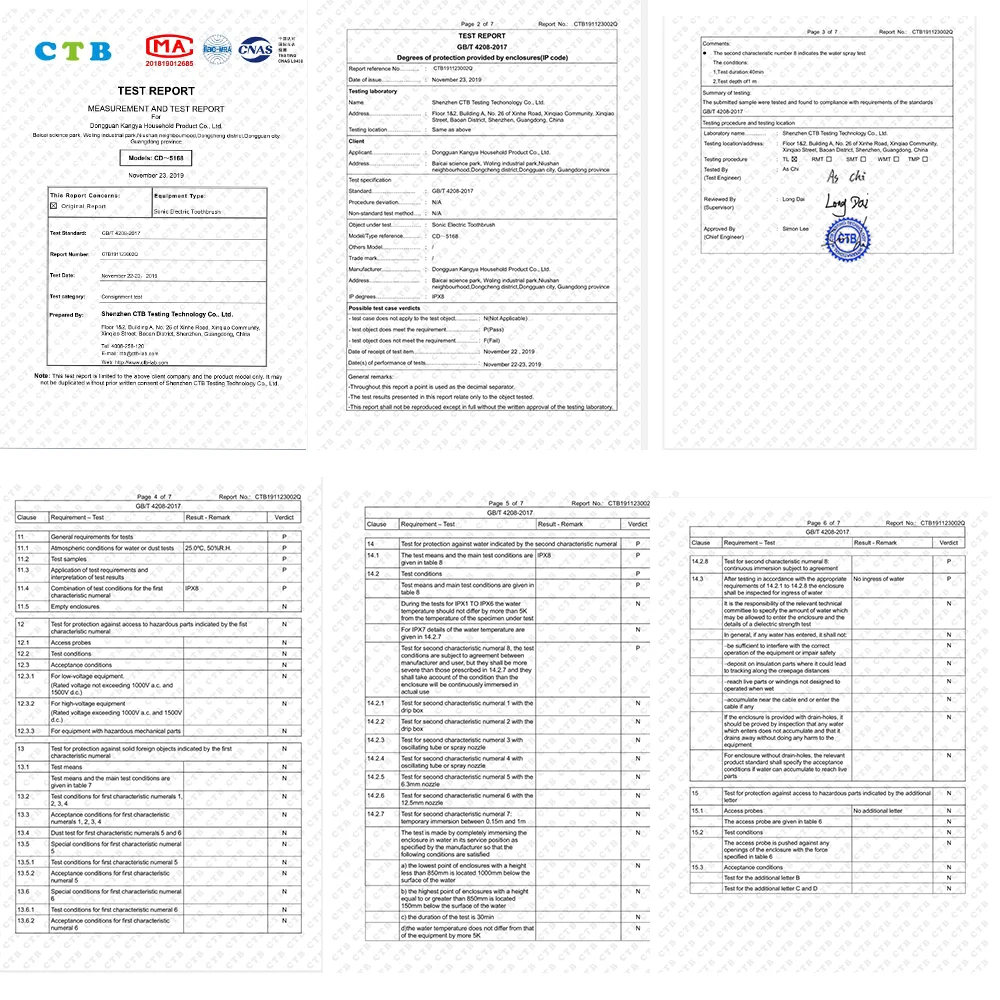 Uwaga: ta elektryczna szczoteczka do zębów przeszła test wodoodporności IPX8, a opakowanie zewnętrzne będzie oznaczone tylko IPX7, dzięki czemu można go używać z pewnością siebie. Załączyć certyfikat raportu z badań.