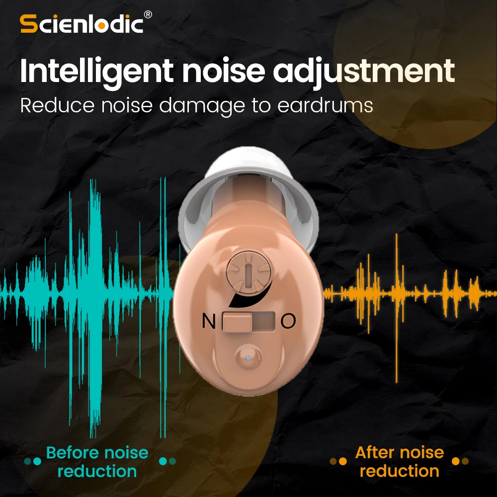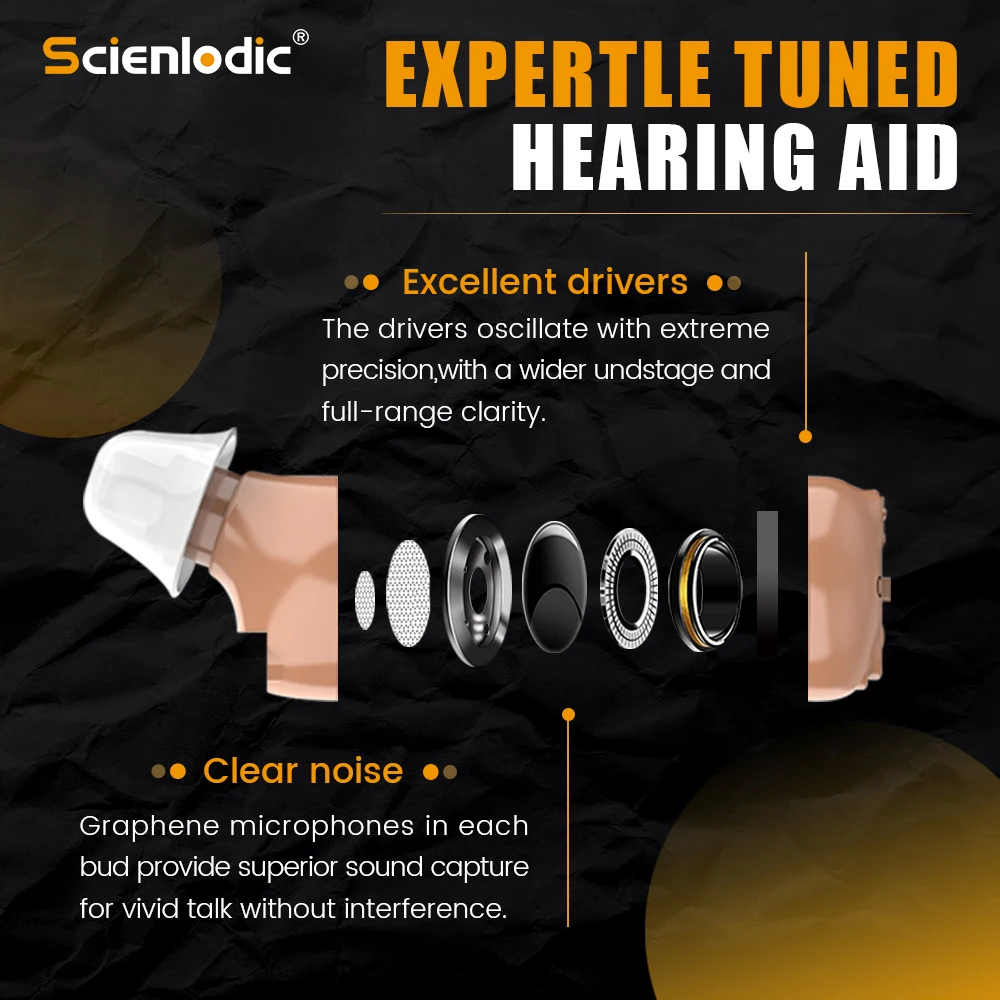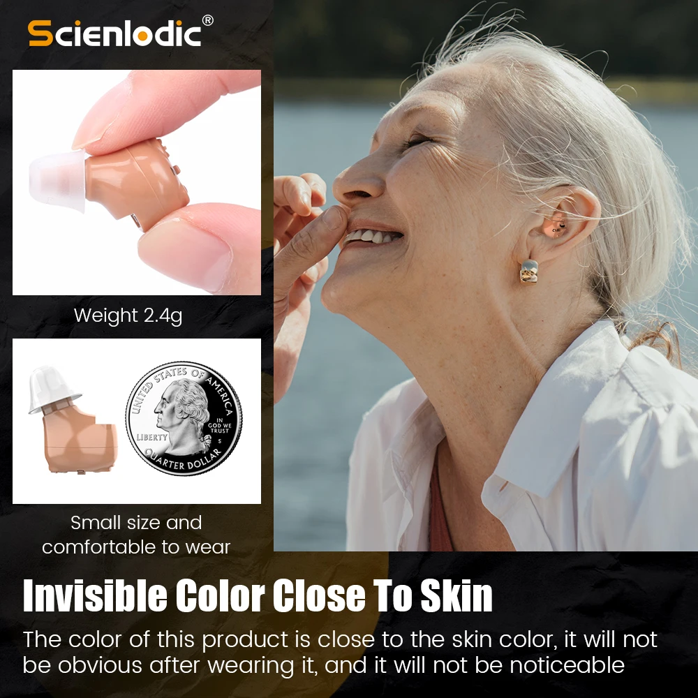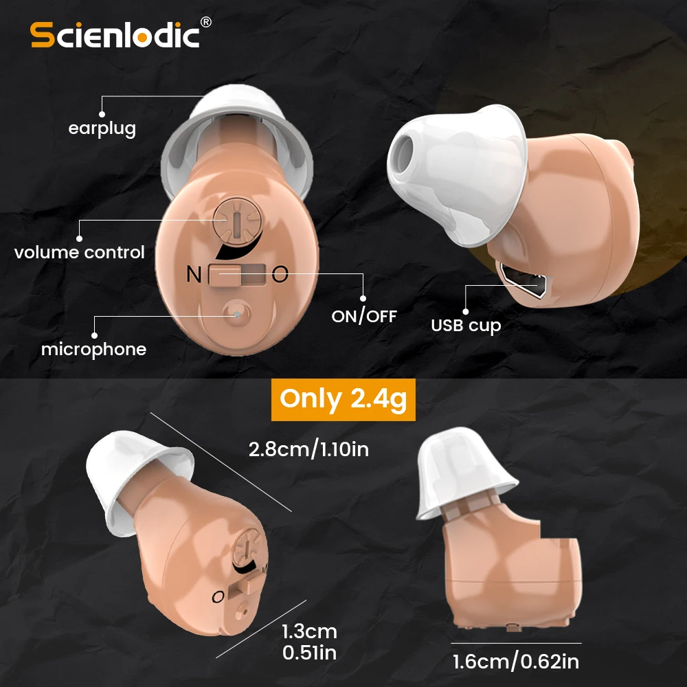 2. Super mały rozmiar: aparat słuchowy rozmiar z ucha tylko 0.659*0.0.4*0.23 cala, waga tylko 1g, który może być dobrze ukryty w uszach.