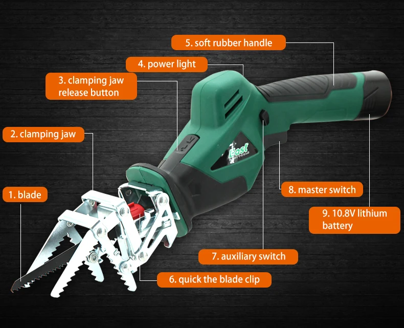 1. Ostrze 2. Szczęka zaciskowa 3. Przycisk zwalniający szczękę 4. Lampka zasilania 5. Z miękkim gumowym uchwytem 6. Szybki zacisk ostrza 7. Przełącznik pomocniczy 8. Przełącznik główny 9.(10.8V) bateria litowa