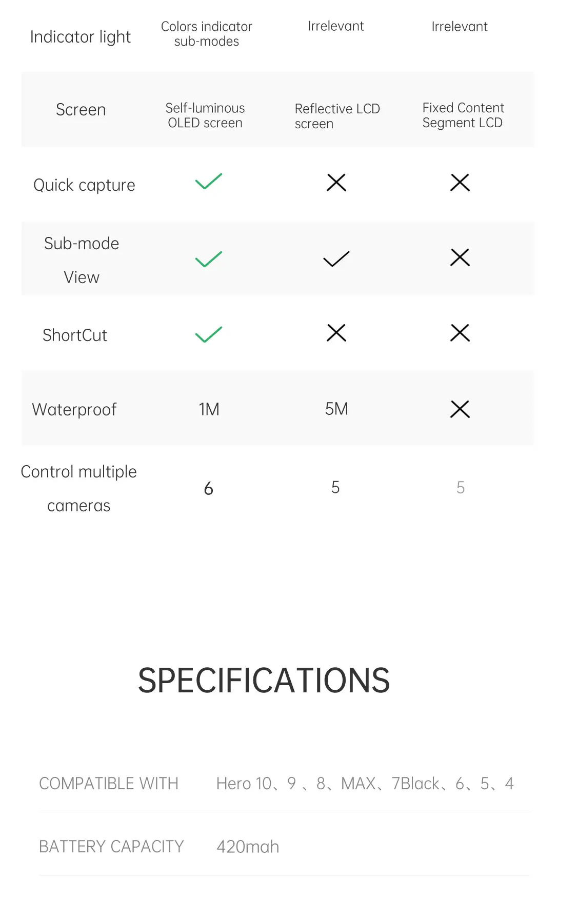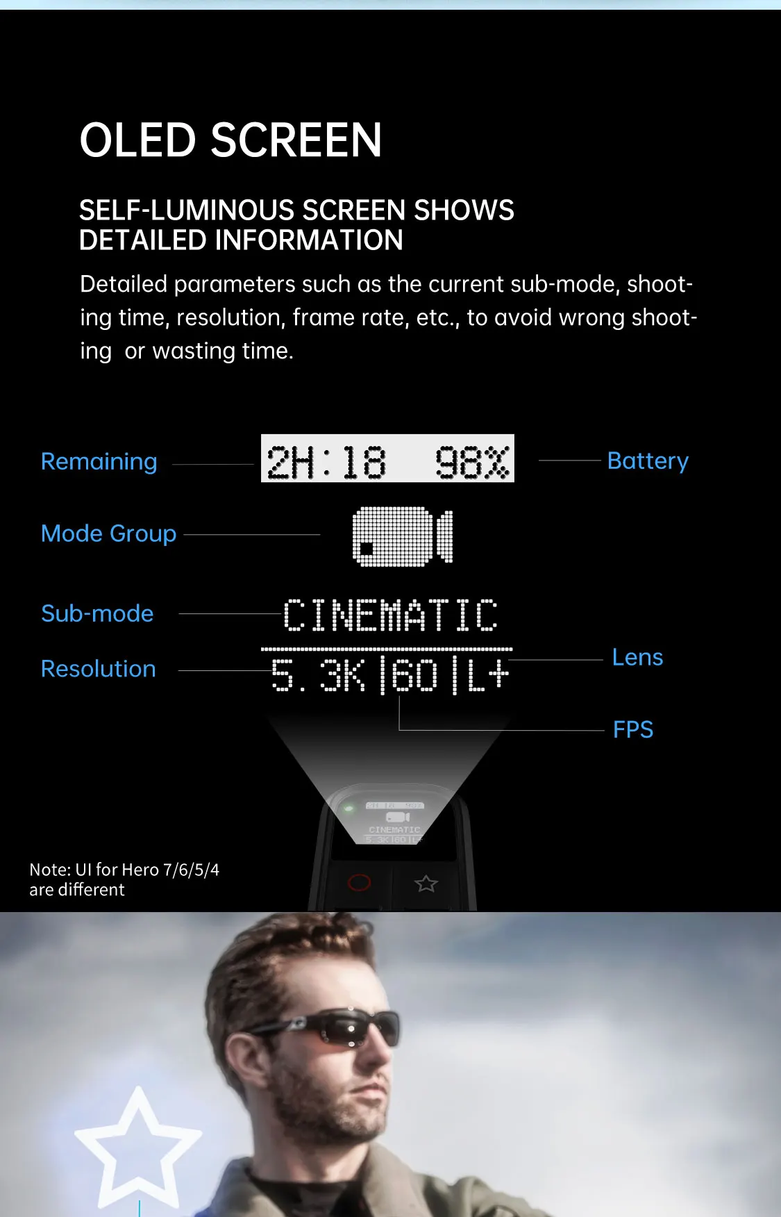1. Ekran OLED wyświetla aktualny podtryb i rozdzielczość, FPS, obiektyw i inne szczegółowe parametry, ale inne zdalne sterowanie innych firm nie ma tych