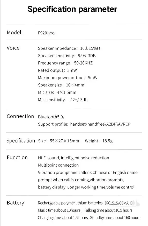Funkcja wyświetlania baterii: jeśli twój telefon ma wersję bluetooth BT5.0 lub nowszą. F920 Pro ma wyświetlacz baterii.