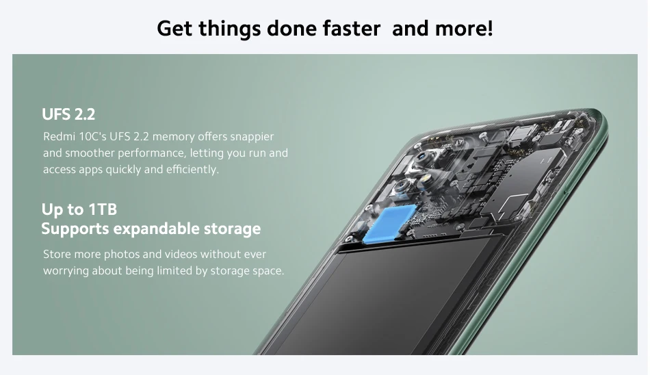 Pamięć UFS 2.2 Redmi 10c oferuje snappier i płynniejszą wydajność, umożliwiając szybkie i wydajne uruchamianie i dostęp do aplikacji.