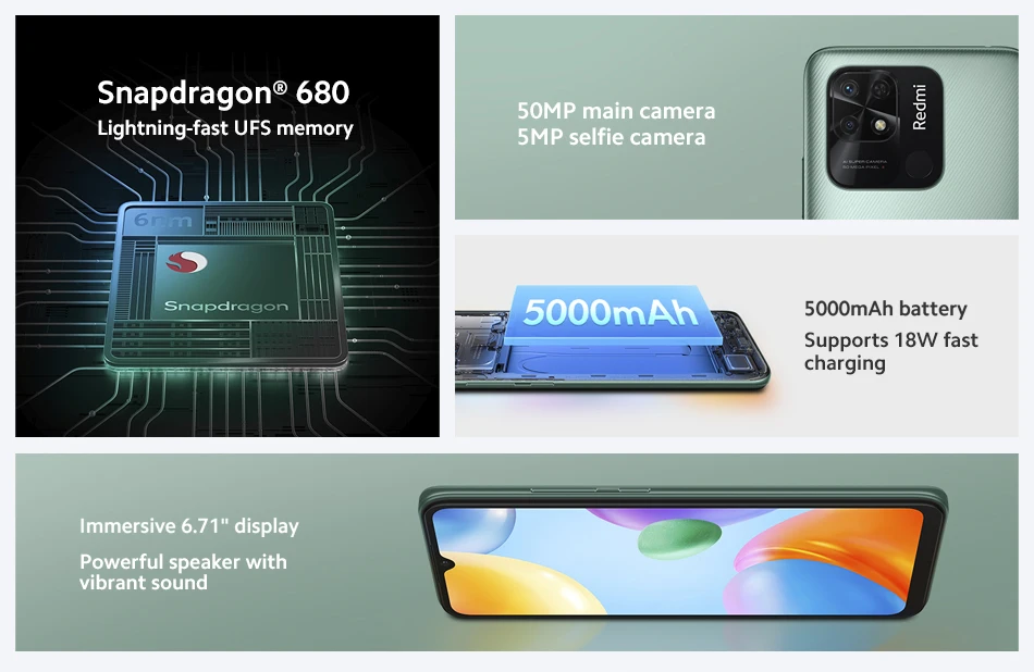 Redmi 10C jest zasilany przez niesamowity ośmiordzeniowy Snapdragon®680 procesor, który jest również zbudowany na flagowym poziomie 6nm procesu. To sprawia, że jest zdolny do doskonałej wydajności, a jednocześnie jest bardzo energooszczędny, wydłużając żywotność baterii Redmi 10c.