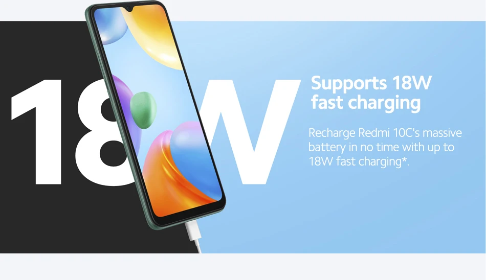 Naładuj masywną baterię Redmi 10c W krótkim czasie z szybkim ładowaniem do 18W *.
