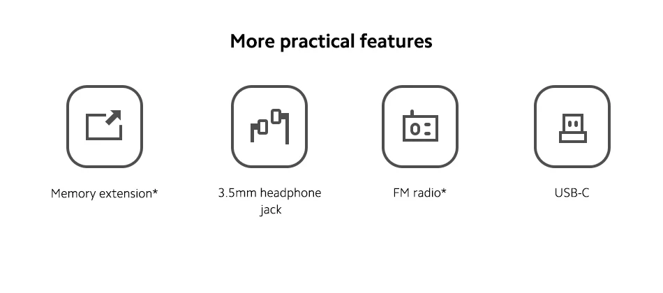 Rozszerzenie pamięci * | Gniazdo jack do słuchawek 3.5mm | radio FM * | USB-C