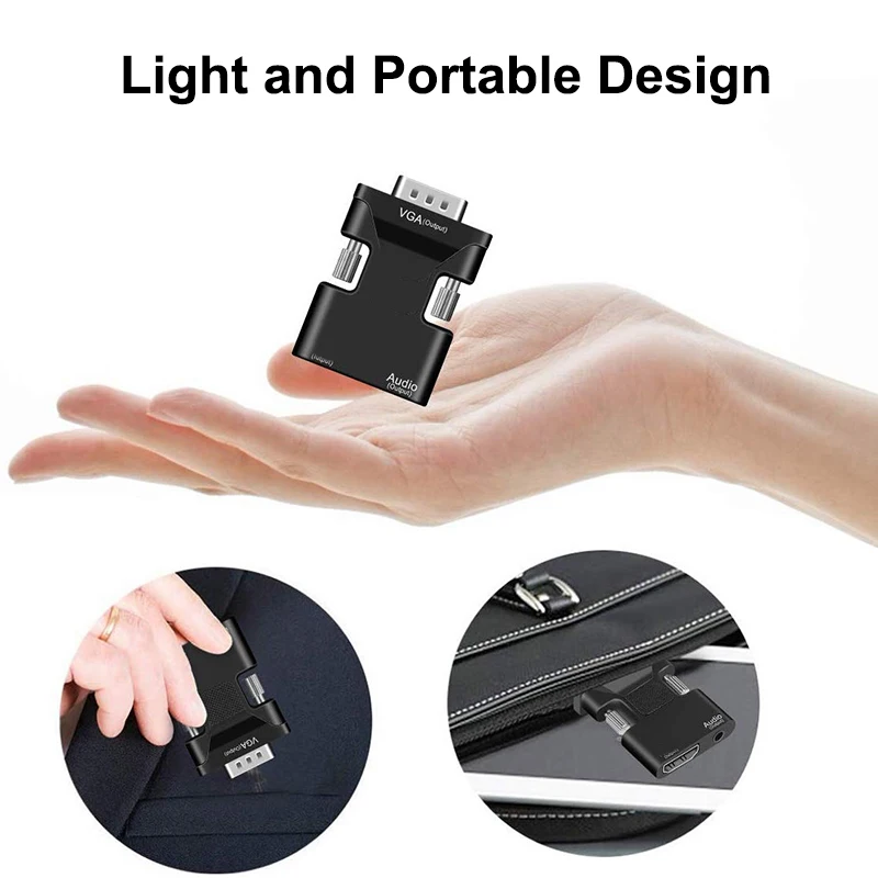 Adapter HDMI kompatybilny z VGA obsługuje rozdzielczości wideo do 1080P, co czyni go wygodną opcją dla aplikacji o wysokiej rozdzielczości i ma kompaktową konstrukcję bez zewnętrznego źródła zasilania, co zapewnia przenośne rozwiązanie, które jest łatwe do przenoszenia jako akcesorium.