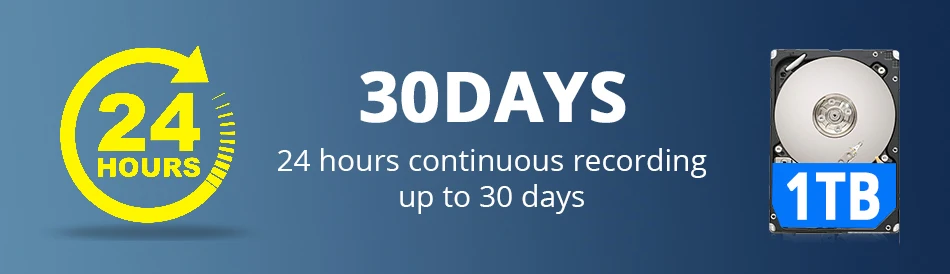 Dysk twardy jest niezbędny do nagrywania wideo, Dzięki za wysoką wydajność H.265 technologia kodowania wideo dysk twardy 1TB umożliwia ciągłe nagrywanie około 20 dni materiału wideo dla 4 kamer (dysk twardy 3TB może kontynuować nagrywanie około 20 dni materiału wideo dla 8 kamer). Gdy dysk twardy jest pełny, możesz ustawić go, aby zastąpić stary materiał wideo lub zatrzymać nagrywanie.
