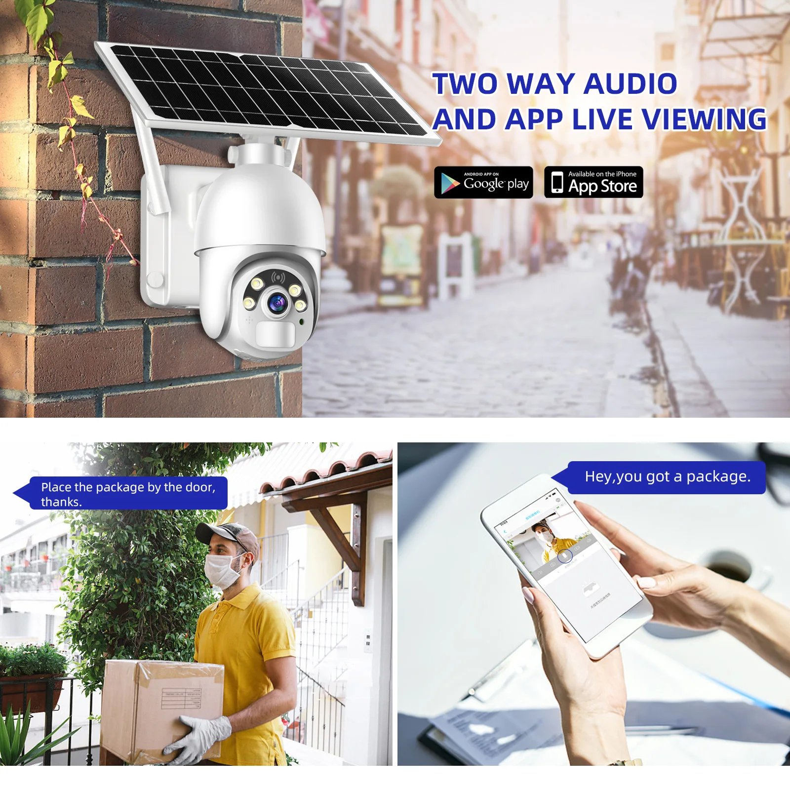 【Pan tile & PIR Smart detection】 z 320 stopni w poziomie i 90 stopni w pionie pan tilt, jasne dwukierunkowe audio, kamera słoneczna wykorzystuje bardzo czuły czujnik ruchu PIR zmniejszyć fałszywe alarmy, Z kątem wykrywania 120 stopni rejestruje wszystkie działania.