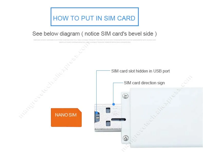 To 4g modem USB nie obejmują karty SIM, użytkownik musi, aby kupić karta NANO SIM z lokalnych operatorów, aby móc korzystać z tego urządzenia.