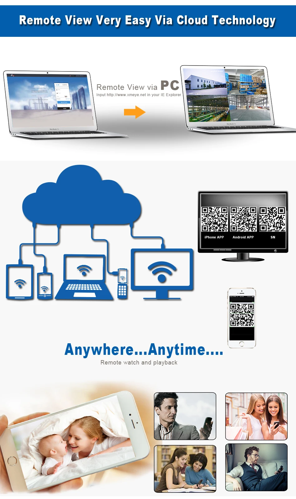 Korzystanie z najnowszej technologii chmury, zawsze i wszędzie… Możesz zdalny podgląd za pomocą smartfonów, tabletów, notebooków lub komputera.