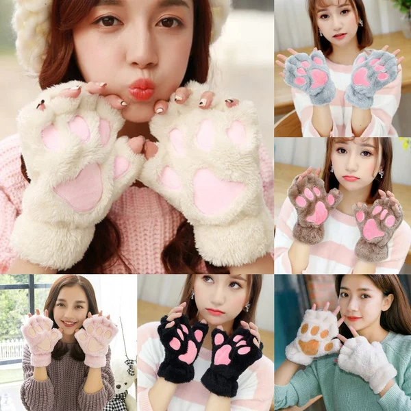 Zimowy uroczy kreskówkowy kot dziewczyna rękawiczki bez palców, grube puszyste niedźwiedzie paw pół palca rękawiczki
