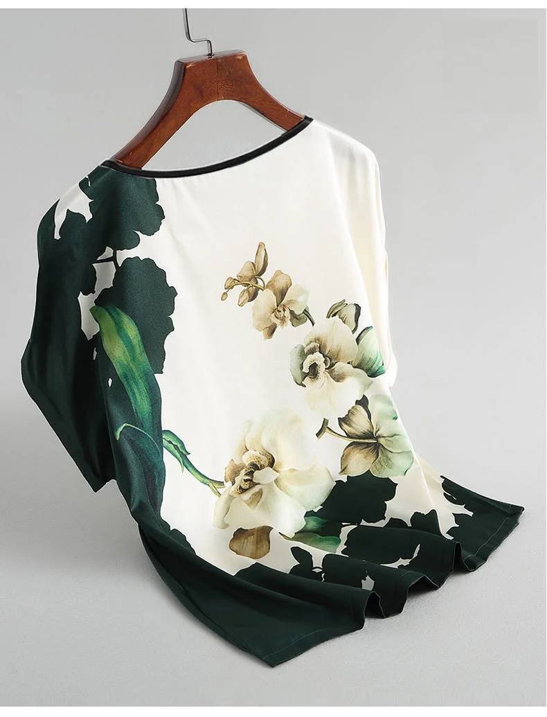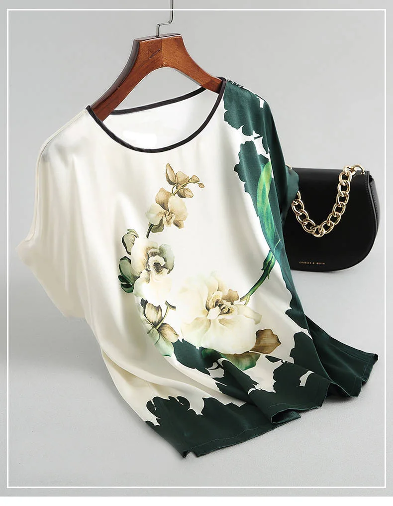 Modne kwiatowe bluzki z nadrukiem bluzki damskie satyna jedwabna bluzki Plus rozmiar rękaw w kształcie skrzydła nietoperza nadruk w stylu Vintage Casual bluzki z krótkim rękawem