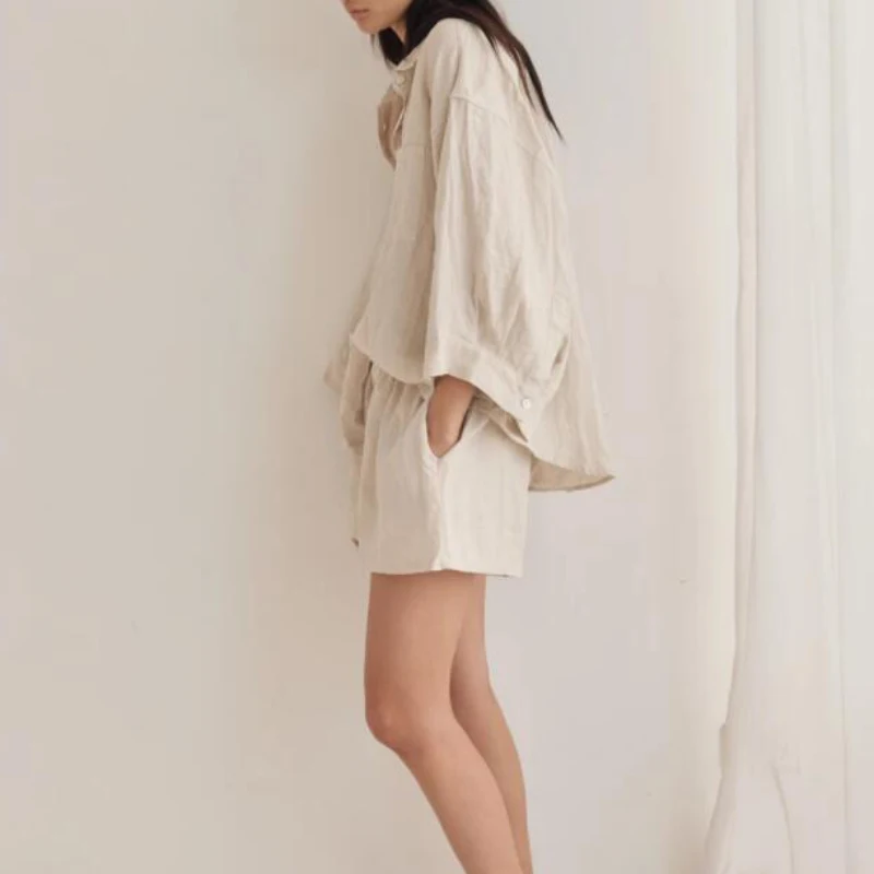Bardzo fajny zestaw! Tkanina jest miękka i przyjemna, a co najważniejsze-bardzo lekka i praktycznie nie czuje się na ciele. Latem w upale najbardziej to! Guziki wszędzie są rozpięte, w szortach znajdują się kieszenie