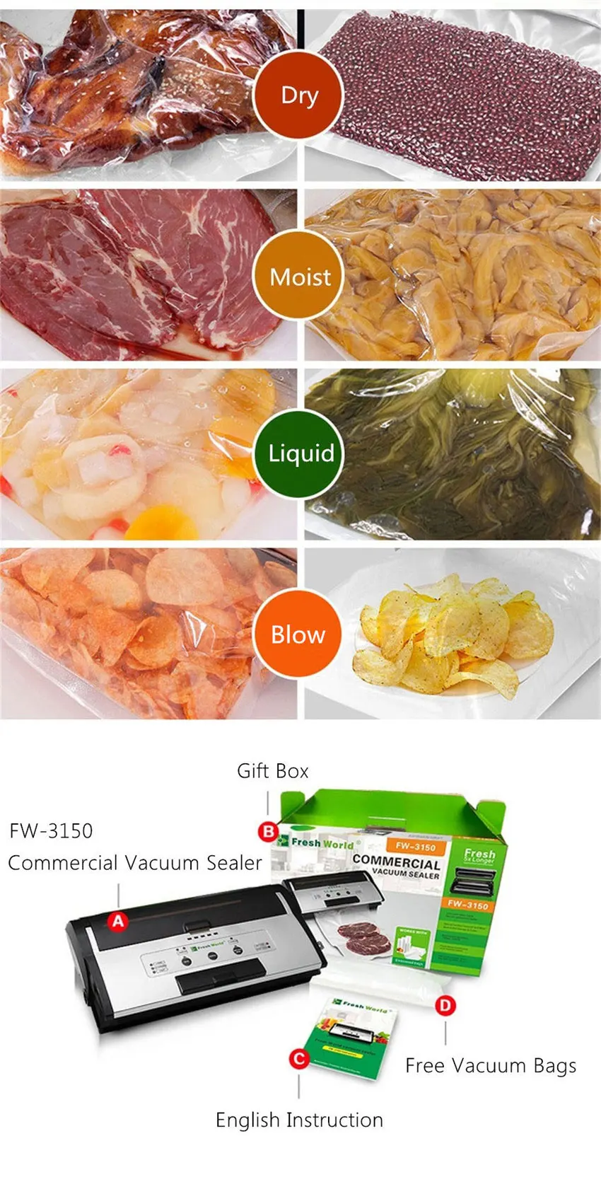 * Fresh World Brand koncentruje się na konserwacji żywności od ponad 10 lat, * FW-3150 maszyna to profesjonalna najlepsza zgrzewarka próżniowa dla ciebie, * silny rdzeń, super silnik, wiele funkcji; * Różne tryby pracy zgodnie z wymaganiami; * do 100 razy ciągłej pracy; * Dotyczy komercyjnych i domowych.