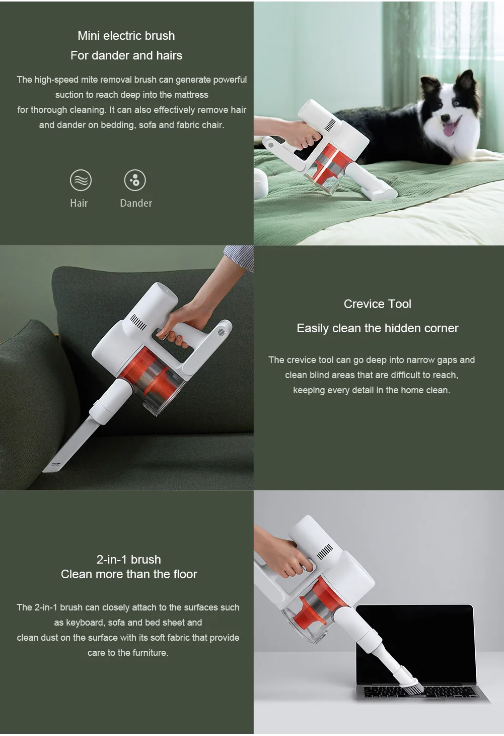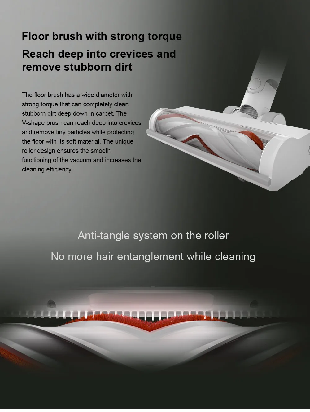 Szczotka podłogowa ma szeroką średnicę z silnym momentem obrotowym, który może całkowicie oczyścić uporczywy brud głęboko w dywanie. Szczotka w kształcie litery v może sięgać głęboko w kredki i usuwać drobne cząstki, jednocześnie chroniąc podłogę miękkim materiałem. Unikalna konstrukcja zapewnia płynne funkcjonowanie próżni i zwiększa wydajność pochylania.