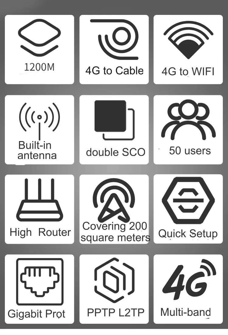 CPE1200K to wysokowydajny produkt komunikacji bezprzewodowej opracowany w oparciu o wymagania sieci 4G. Bezprzewodowa prędkość WiFi wynosi do 1200 mb/s i może obsługiwać 64 wymagania dostępu do internetu w tym samym czasie. Zaspokoić potrzeby małych i średnich sieci, takich jak biura i domy, aby uzyskać stabilny, bezpieczny i prosty dostęp do internetu. Może on również być stosowany w Internet rzeczy branży komunikacji, aby zapewnić użytkownikom bezprzewodowy pilot zdalnego monitorowania danych, gromadzenie i przekazywanie funkcji. Pełny dostęp do sieci Netcom 4G, pełna linia kompatybilna z siecią 4G/3G/2G, wyposażona w trzy adaptacyjne interfejsy Ethernet LAN 10/100/1000 mb/s, podłączony do wewnętrznej sieci LAN; 1 adaptacyjny interfejs Ethernet WAN 10/100/1000 mb/s, zapewnia przewodowy dostęp szerokopasmowy.