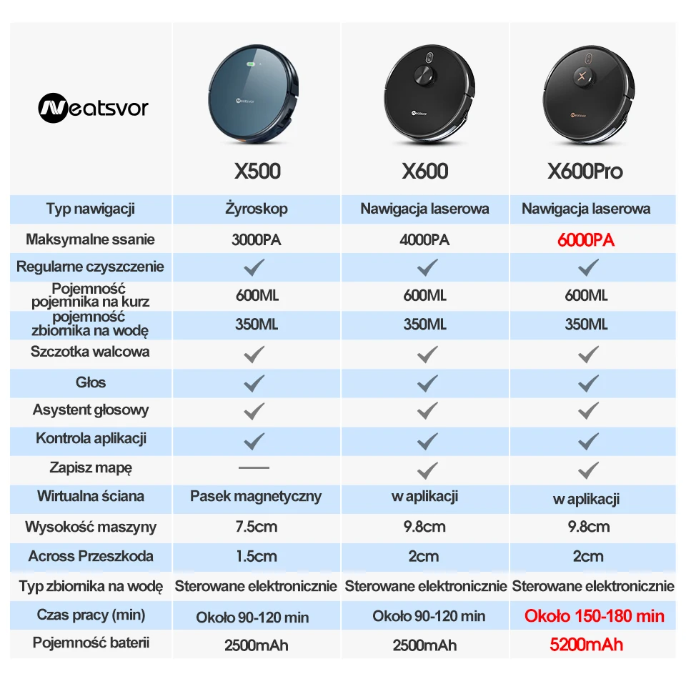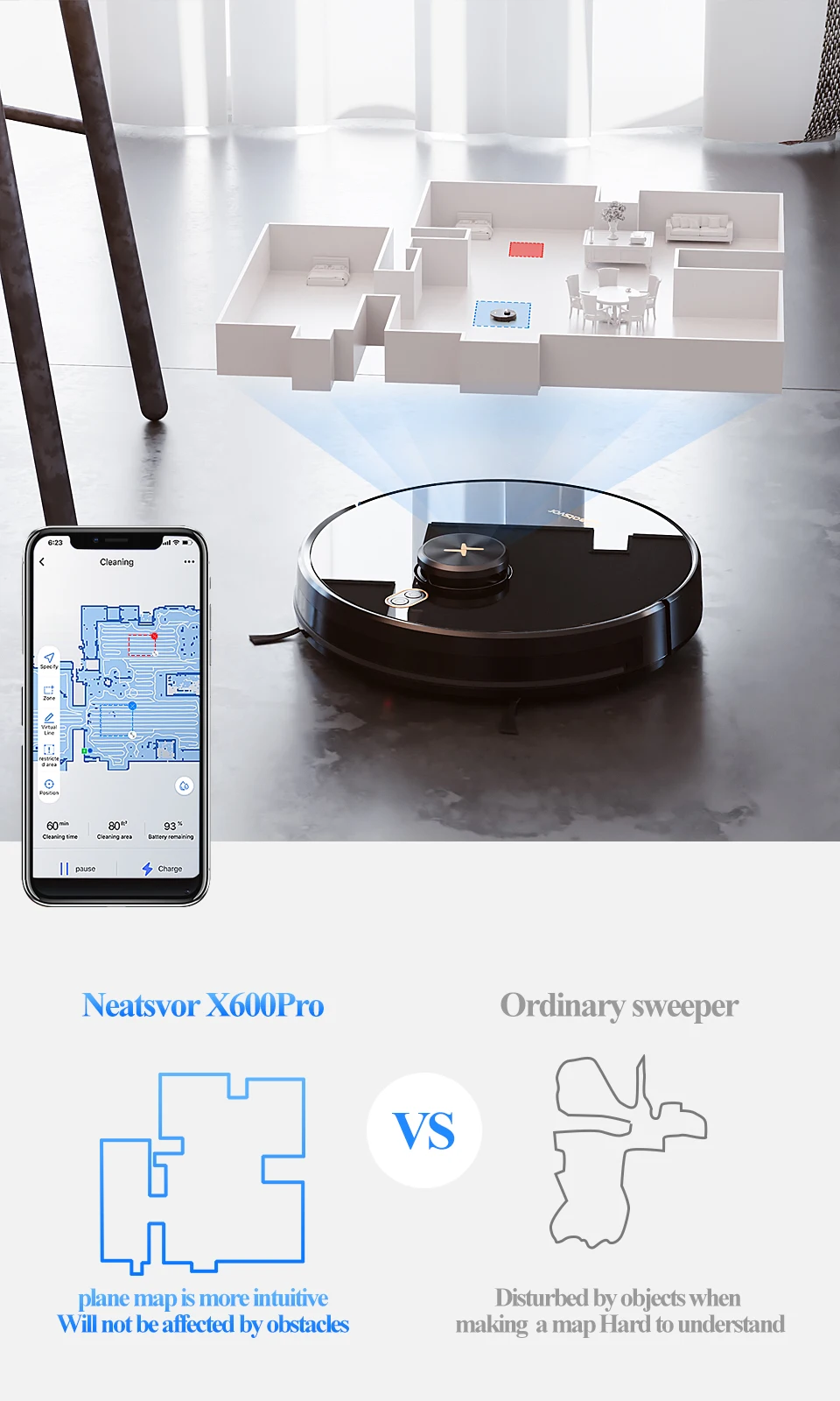 Neatsvor x600pro – zapewnia czyste podłogi każdego dnia, na całym poziomie domu. Użyj aplikacji, aby sprzątać lub planować z dowolnego miejsca i o każdej porze. X600pro dokładnie wie, gdzie był i gdzie musi się udać, ładując w razie potrzeby, aż praca zostanie wykonana. Jego moc ssania wynosi do 6000 Pa, wyłapując brud, kurz, wszelkiego rodzaju włosy i większe zanieczyszczenia z twardych podłóg i dywanów. Dzięki dwóm wyjątkowo długim szczotkom bocznym x600pro pracuje wydajniej tam, gdzie kryje się brud.