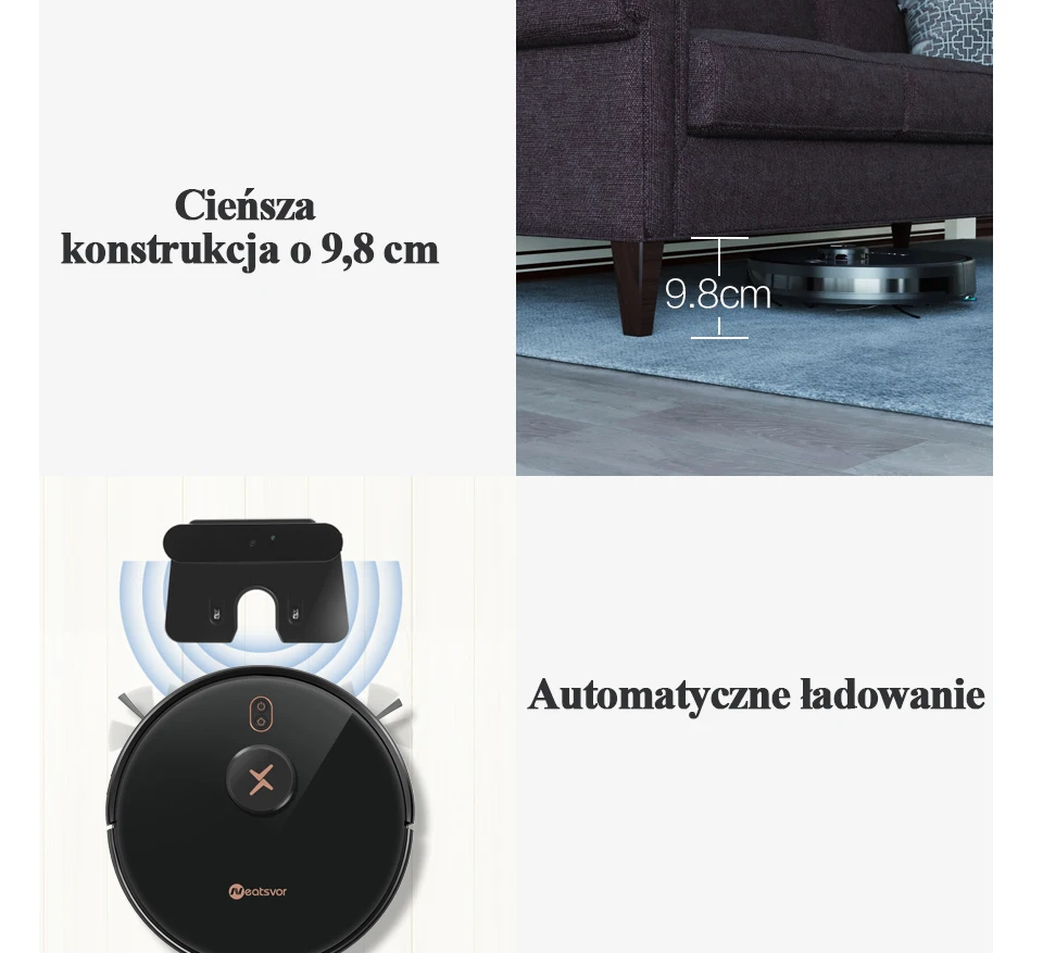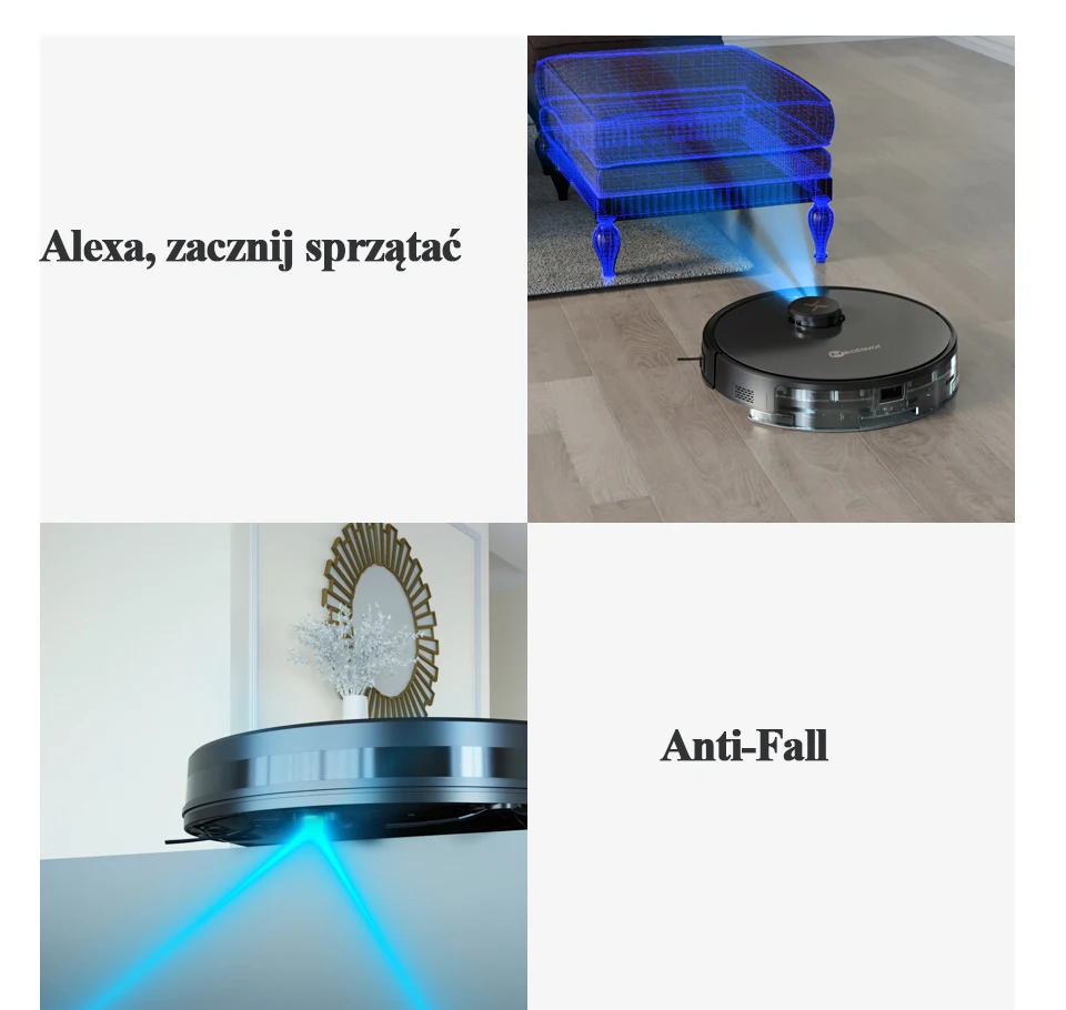 Nie tylko może wspinać się po łuku, ale także łatwo wspinać się po schodach pod kątem prostym i progach. Typowe przeszkody, prowadnice ślizgowe w domu nie mogą zatrzymać jego kroków, można go również używać na różnych twardych podłogach, takich jak parkiet, płytki , laminat itp. Nawet dywany nie stanowią dla niego problemu. Pokonuje krawędzie i stopnie do 2 cm.