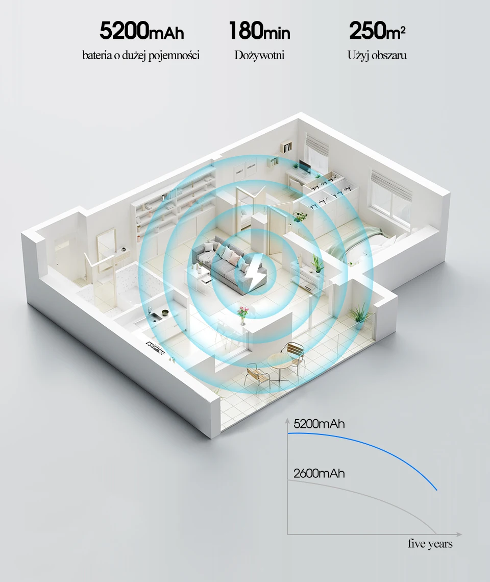 5200mAh czyści do 110 minut na jednym ładowaniu i napełnieniu wodą, z łatwością pokrywając 250 metrów kwadratowych.