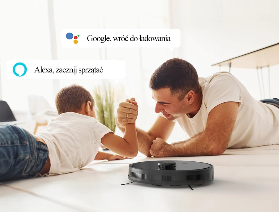 Można pracować z kanapy, przez smartfona lub wygodnie za pomocą zdalnego robota. Robotem mopem próżniowym można sterować i programować z dowolnego miejsca za pośrednictwem bezpłatnej aplikacji na systemy iOS i Android. Aplikacja oferuje szeroki wachlarz funkcji i opcji. Procesy sprzątania można monitorować, można ustawić harmonogram lub zdefiniować dobór odpowiednich trybów sprzątania. Nadaj robotowi odkurzającemu kolejność pracy za pośrednictwem Google Home lub Amazon Alexa.