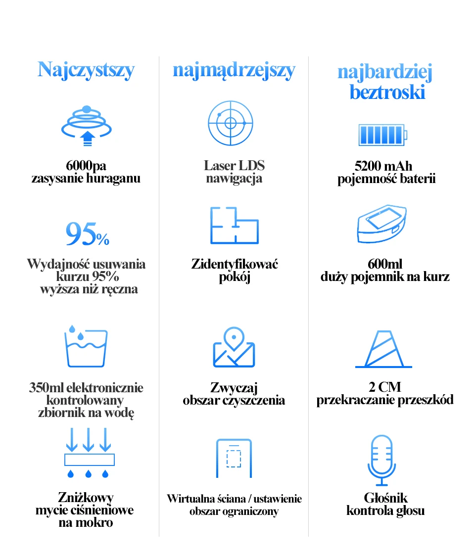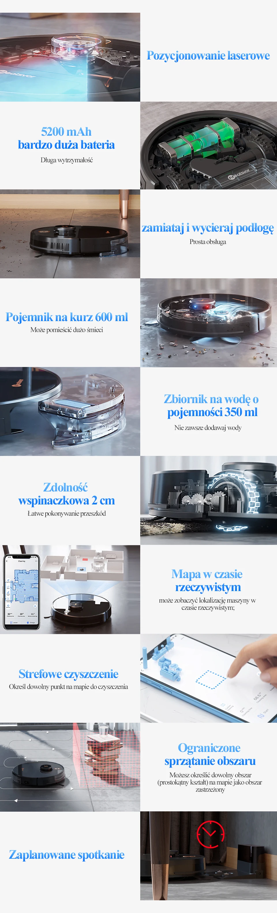 bardzo dobry odkurzacz w tym przedziale cenowym. szklana pokrywa dodaje mu uroku. ma naprawdę dużą siłę ssania. aplikacja jest prosta w obsłudze, bardzo łatwo połączyć ją z robotem. dzięki ciśnieniowe mu systemowi podawania wody na MOP jest bardzo skuteczny. przy maksymalnym ustawieniu podawania wody zbiornik wystarczył na 75 m2 i jeszcze była w nim woda. bardzo dobrze przygotowuje mapę i można wydzielać na niej strefy. jak dla mnie w tym przedziale cenowym jest bezkonkurencyjny polecam.