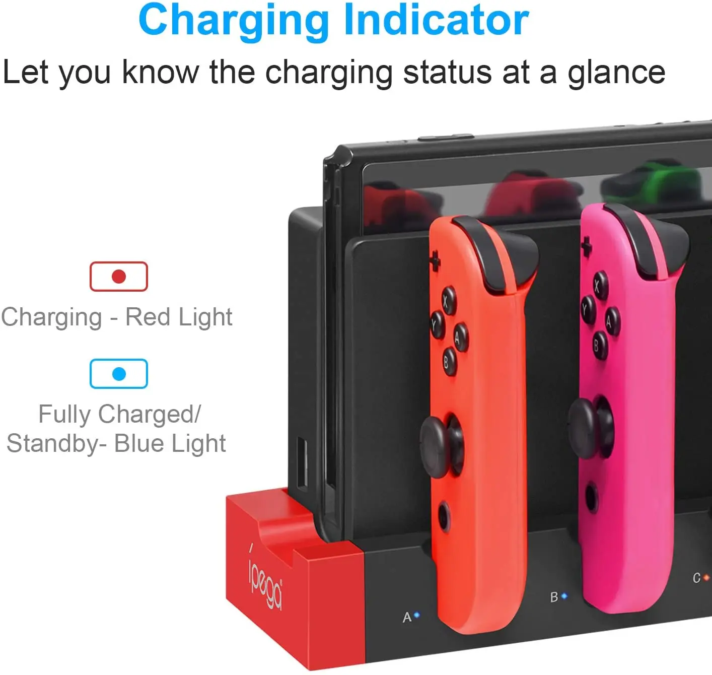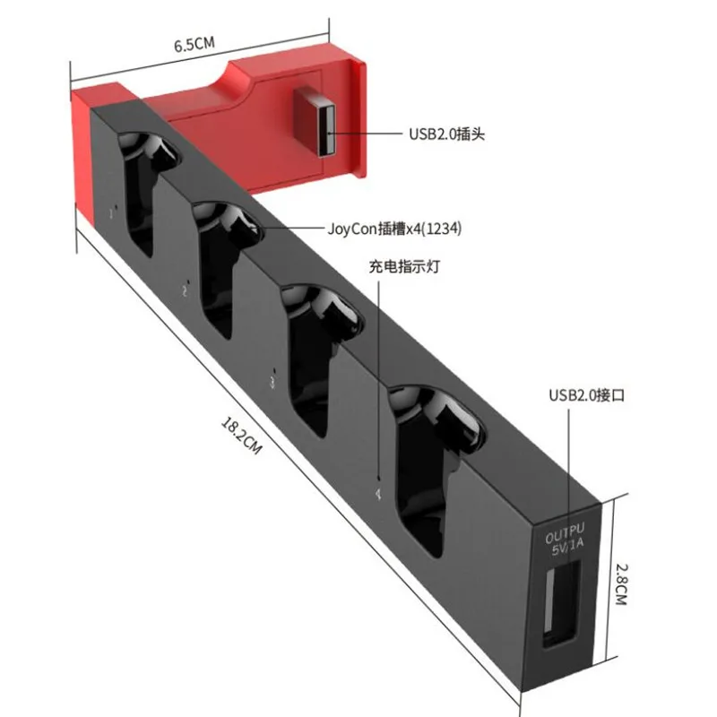 2. Przedmiot ma 4 gniazda ładowania ABCD, które obsługują ładowanie od 1 do 4 uchwytów JoyCon w tym samym czasie.
