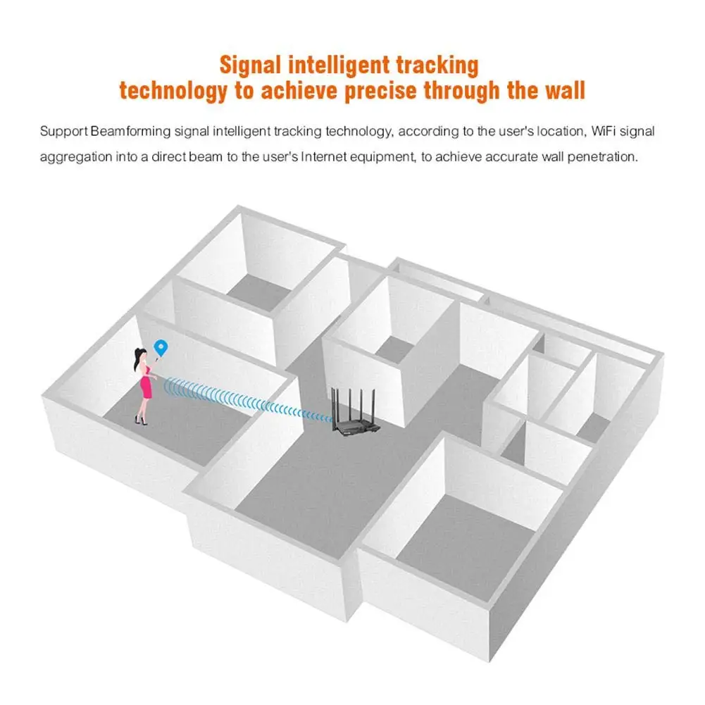 Korzystając z niezależnego modułu wzmocnienie sygnału, Beamforming inteligentne wzmocnienie sygnału technologii i pięć 6dBi o wysokiej mocy anteny, sygnał obejmuje 120 metrów kwadratowych i może być przebite przez trzy ściany, i obsługuje regulacji intensywności sygnału.