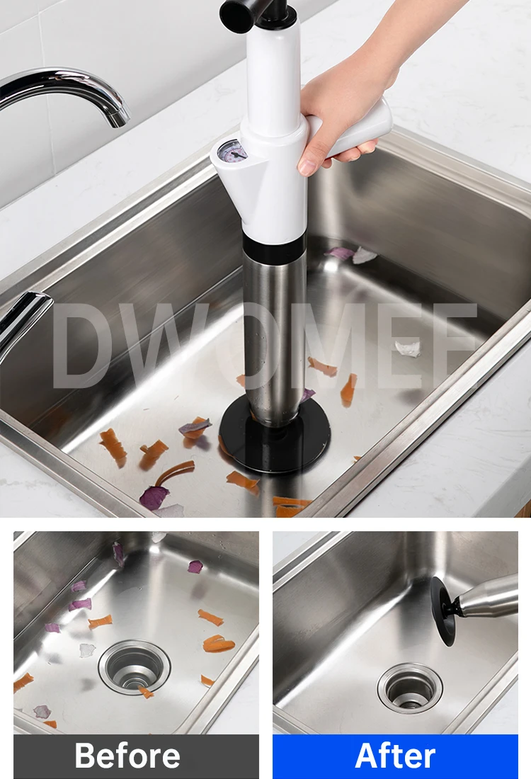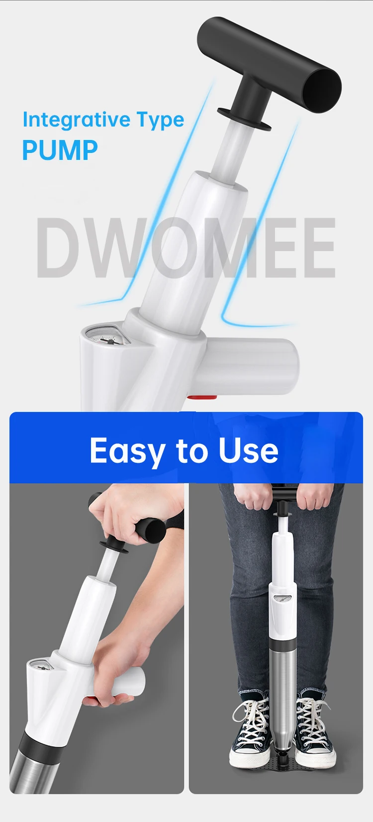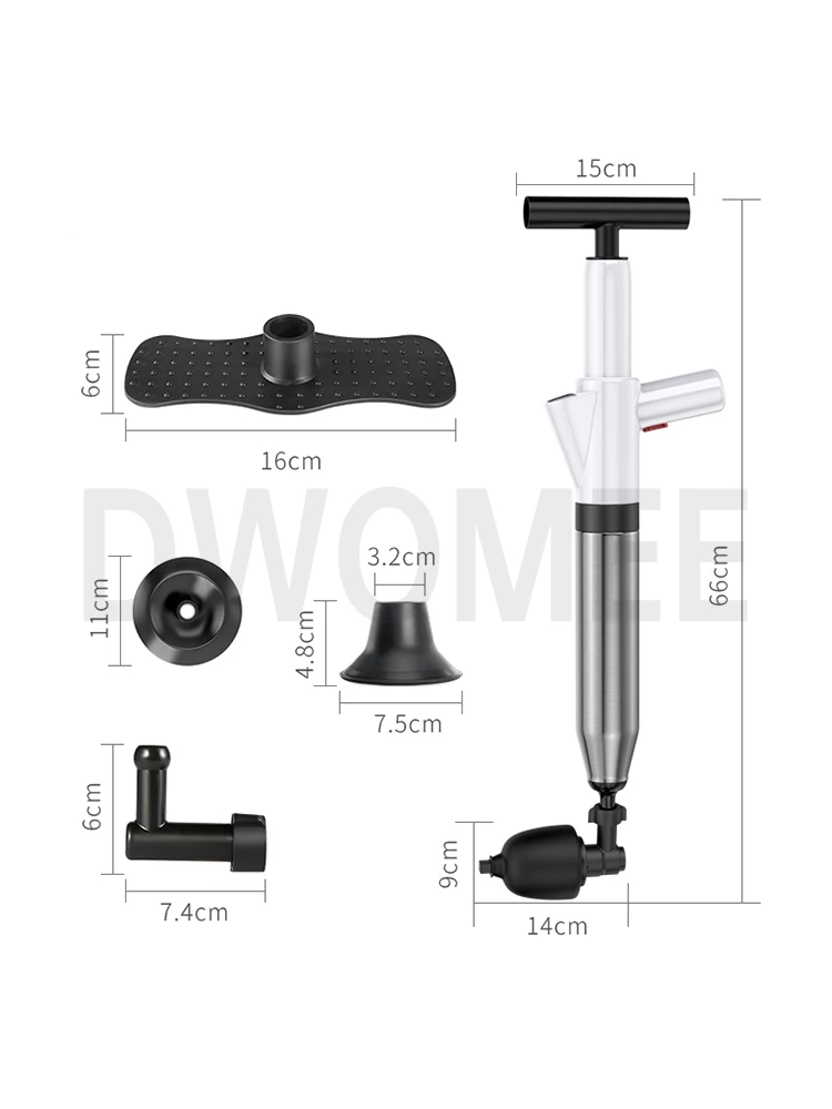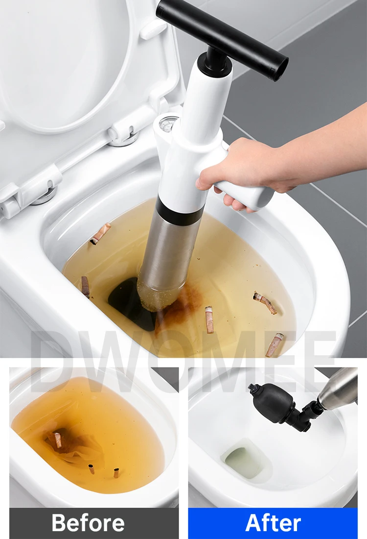 Po prostu pompuj poduszka powietrzna i włóż zablokowany odpływ, naciśnij przycisk powietrza, aby wyczyścić toaletę lub zlew.