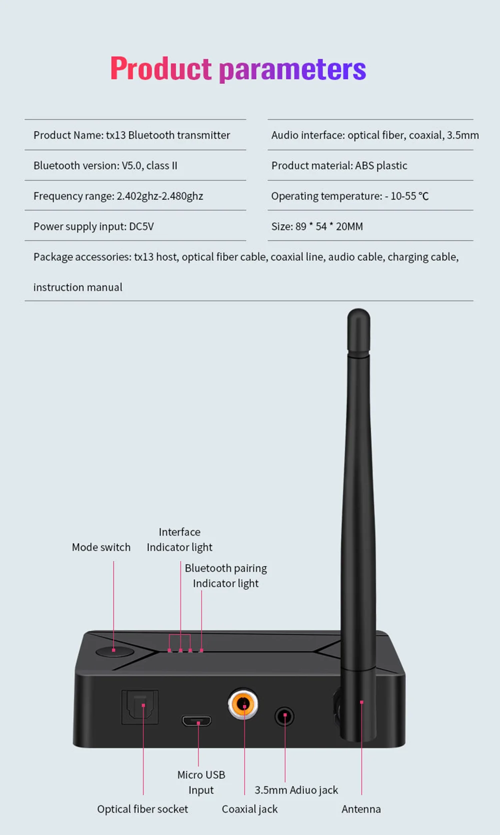 1: TX13 to dwufunkcyjny adapter Bluetooth z światłowodem. Koncentryczne. Transmisja Bluetooth 3.5mm i cyfrowy na analogowy. Wykorzystuje zasilanie USB5V. Po włączeniu przechodzi w stan wyszukiwania i parowania, a czerwone światło miga szybko. Może przesyłać muzykę z telefonów komórkowych, walkmana, telewizora, komputera i innych urządzeń na odbiornik Bluetooth, stereofoniczny zestaw słuchawkowy Bluetooth, głośnik Bluetooth i inne urządzenia bezprzewodowo.