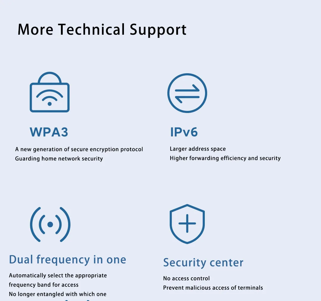 Szyfrowanie WPA-PSK/WPA2-PSK/WPA3-SAE, bezprzewodowa kontrola dostępu (czarna lista i biała lista), ukrywanie SSID, inteligentne zapobieganie nieautoryzowanemu dostępowi