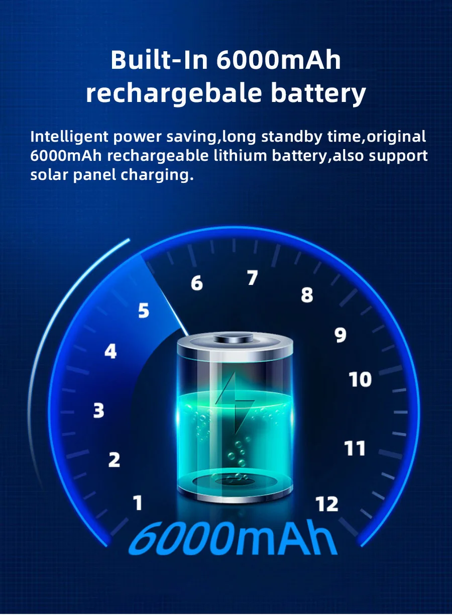 Inteligentna moc oszczędzania, długi czas czuwania, oryginalny akumulator litowy wielokrotnego ładowania 6000mAh, obsługuje również ładowanie paneli słonecznych.