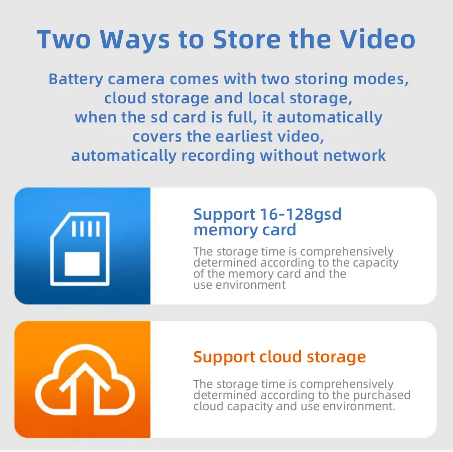 Akumulator aparat jest wyposażony w dwa tryby przechowywania, przechowywania w chmurze i lokalnej pamięci masowej, gdy karta sd jest pełna, to automatycznie obejmuje najwcześniej wideo, automatycznie nagrywanie bez sieci