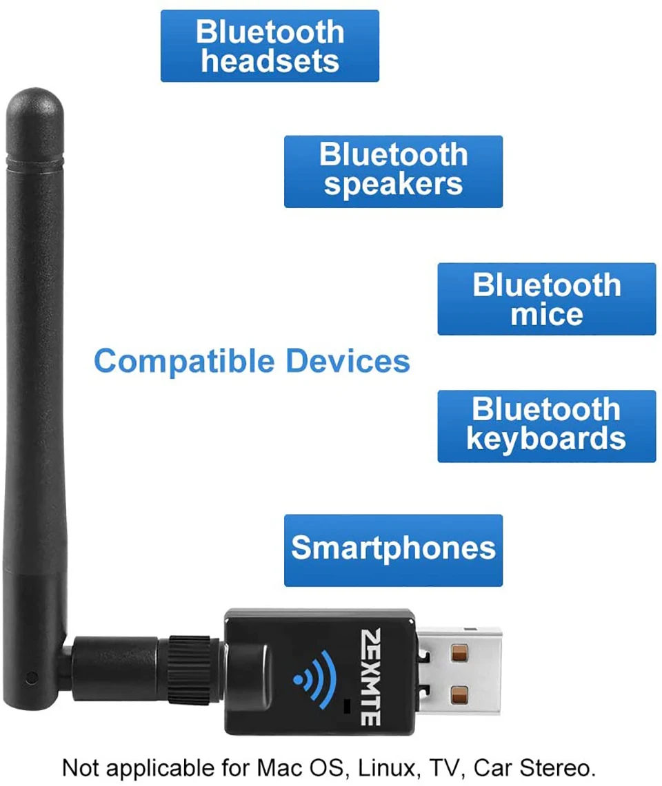 ▫Ekran Bluetooth 5.0 jest odpowiedni dla 32/64-bitowego systemu Windows 10/8/7. Może również w pełni wykorzystać przepustowość do podłączenia wielu urządzeń Bluetooth w tym samym czasie, takich jak zestaw słuchawkowy Bluetooth/głośnik/mysz/klawiatura, inteligentny telefon. Nie dotyczy Mac OS, Linux, TV, samochodowe stereo.